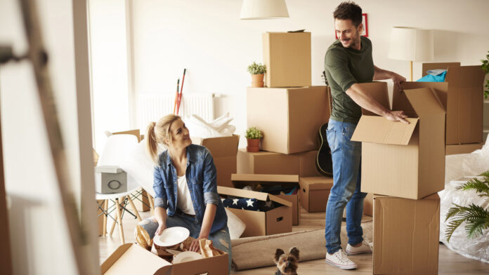 Young couple in new apartment with small dog