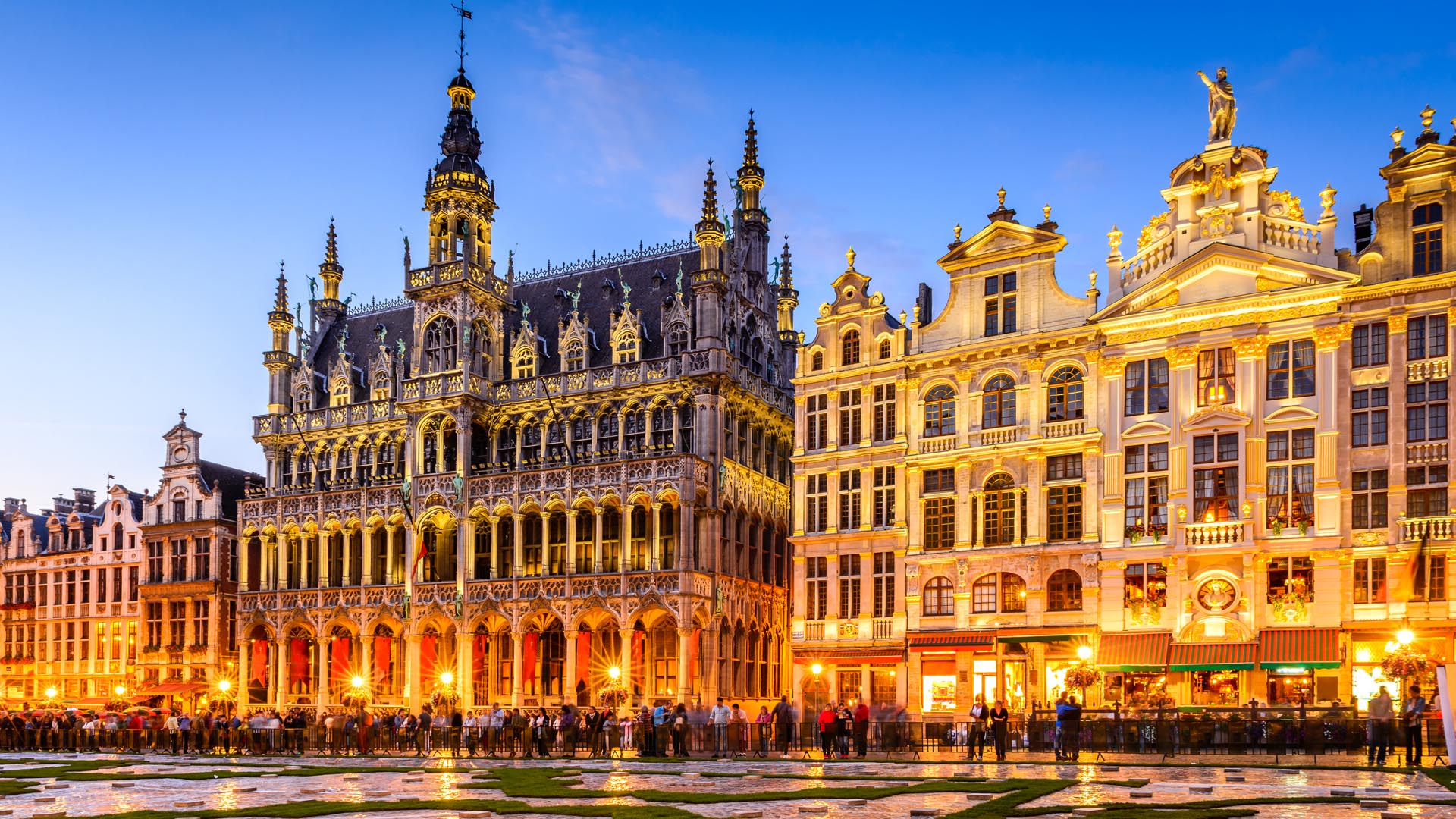 Brussels, Belgium. Wide angle night scene of the Grand Place and Maison du Roi, one of Europe finest historic squares and a must-see sight of Bruxelles.