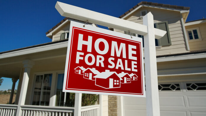 Red Home For Sale Real Estate Sign and House Against a Blue Sky.